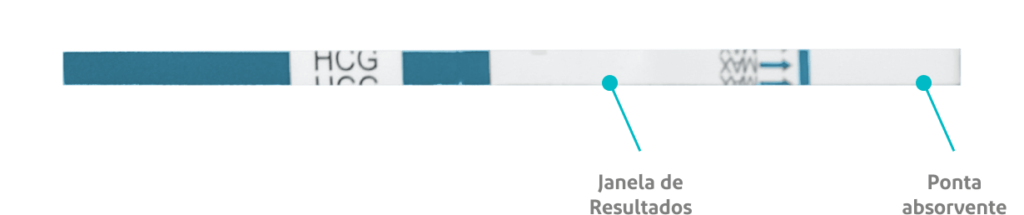 Quando estiver pronta, colete a urina no recipiente limpo e seco. Remova o testes da embalagem e segure-o com a ponta absorvente apontada para baixo.